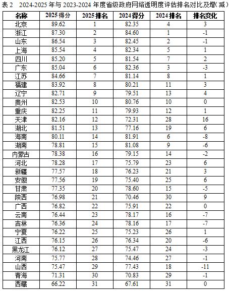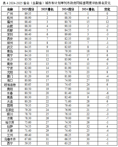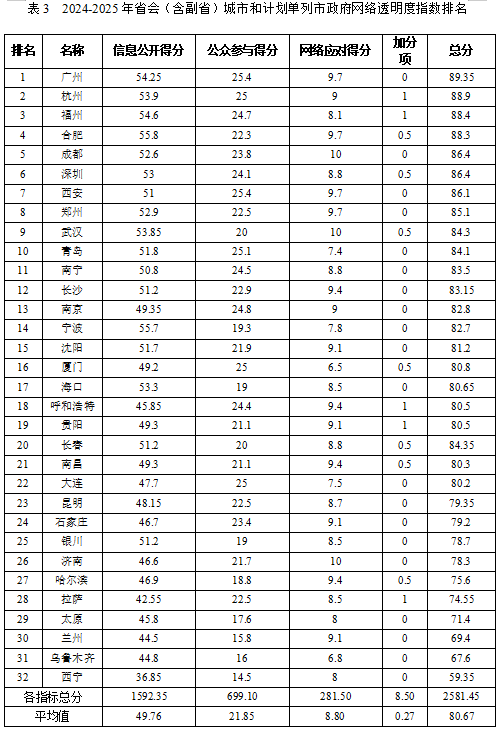 四、评估结果 1、2024-2025年中国大陆31个省(自治区、直辖市)政府网络透明度测评结果 基本情况说明: (1)整体排名: 排名前5名是北京市、浙江省、山东省、上海市、四川省,大多分布在东部经济发达地区,排名最后的5名是河南省、山西省、江西省、青海省和西藏自治区。网络透明度最高的单位得分89.62分,透明度最低的单位得分66.22分,极差为23.4分,各省政府网络透明度水平差距较大。 (2)排名变化 与上一评估年度相比,2024-2025年网络透明度指数,天津进步最快,比上一年排名前进16个名次。天津在信息公开、公众参与和网络应对三方面均取得进步。在信息公开上,政府数据开放数量、招投标信息、社会保障信息等信息公开内容较前一年更为全面和细致;在公众参与上,一是投诉咨询的响应速度较快,在线咨询有公开咨询投诉的时间信息,回复时间约在72小时内;二是较前一年民意征集、网上调查、在线访谈等政民互动数量有所增加;三是政民互动功能内容设计也得到优化:设置政务访谈(开放预告和回顾)、回应关切、政民零距离(分有对话市长、区长、委办局领导的留言板块,设有留言选登、各单位留言统计等功能区)以及民意征集和网上调查等政民互动功能板块。网络应对上,天津政务微博的影响力较去年也有所提升。陕西、湖北、河北、安徽等排名较2023-2024年也有较大的提升。 排名下降最大的是山西,海南、云南、吉林、湖南、江西、甘肃的排名较2023-2024年也有不同程度的下降。与前一年相比,山西在公众参与方面表现良好,主要失分在信息公开和网络应对方面,排名较前一年下降11名:信息公开方面主要在政府数据开放数量和依申请公开处较前一年扣分较大,在“三公”经费、土地使用权出让、保障性住房分配信息、社会保障信息的公开也存在不同程度的扣分,需要进一步完善;网络应对方面,主要因政务微博影响力较前一年有所下降而扣分。海南较前一年排名下降8名,主要在信息公开和公众参与两方面失分:信息公开方面,主要是因为 “三公”经费、社会保障信息、乡村振兴工作信息等信息的公开以及依申请公开的监督与救济、依申请公开操作不够完备和细致而被不同程度地扣分;公众参与方面主要失分在咨询投诉的响应时速较慢。 (3)总体评价 第一,省级政府的网络透明度水平逐年提升,但东西部整体差距较大。31个省级政府门户网站的网络透明度平均绩效分79.71分,较去年78.33分进步1.38,连续五年网站表现有一定提升。但总体表现层次不齐、差异明显。 第二,指标属性上看,强制性指标表现好,自觉性指标表现差。得分率最高的是强制性指标的信息公开指标(85.87%);其次是约束性指标的公众参与指标(75.81%),而自觉性指标的是政府网络应对指标(66.84%)。 第三,信息公开内容基本覆盖了重要领域,但公开的信息质量需要进一步提高。信息公开类指标平均得分率为85.87%,政府信息主动公开类型以及基层政务公开的重要领域类型,均按要求规定公开,但其中一些公开内容还需要细化,比如土地使用权出让、保障性住房分配信息、学校教育、医疗卫生信息等公开情况不是很全面,部分省份在这几项指标的得分较低,还有很多公开的内容对公民来说缺乏实质的参考价值,多是转发通知,属于政策性、指导性、程序性的信息。 第四,公众参与功能建设整体中等水平。公众参与类指标平均得分率为75.81%,较去年72.73%有明显进步。总体上,政府网站公众参与功能的渠道充足多样,但是需要加快政民互动的响应速度、提高政民互动的内容质量、规范和完善依申请公开的监督与救济。具体来看,在公民参与渠道方面,民众可以选择电话、邮箱、网络留言、网络调查、民意征集、在线访谈等多种方式进行公众参与,部分省份也通过预告+开展领导干部接听市民热线等方式拉进政府与群众的距离。政府在咨询投诉版块的回复总量较往年有所增加、且回复质量较高,内容充实,有实质性的回答和参考解决办法。但是部分网站也存在公众参与响应速度滞后、实时互动与民意征询次数较少等问题。 第五,政务自媒体建设仍然有待升级完善。网络应对指标平均得分率为66.84%,较去年64.49%有一定进步。所有省级政府都开通了政务微信公众号,政府信息公开年报中关于政务微信的运营情况数据可见,政务微信各栏目建设完善可用、政务微信信息发布量较为可观,政务微信的发展走向稳定和成熟;与此同时,所有省均有政务微博开通、绝大多数政府都开通了认证微视频账号,但是政务微博和政务微视频的建设仍需完善,在职领导人公务员实名微博指标上普遍失分高。 2、2024-2025年中国大陆省会(含副省)城市和计划单列市政府网络透明度评估结果 (1)整体排名说明 评估结果表明,排名位于前五位的,是广州、杭州、福州、合肥、成都,这些城市多分布在经济发达地区,排名在中间的多数是中部地区的城市,排名在倒数五位的城市是拉萨、太原、兰州、乌鲁木齐、西宁。 与上一年度相比,广州、杭州,仍然保持前列位置。 进步较大的城市:福州(+12)、海口(+10)、青岛(+8)、沈阳(+8) 退步较大的城市:武汉(-12) (2)指标情况说明 第一,整体网络透明度指数表现中等水平(平均分80.67),较去年78.73有所进步,内部差距但仍然较大。90分以上城市0个;80~90之间的城市22个,70~80分之间的城市7个;60~70分之间的城市2个;60分以下的1个