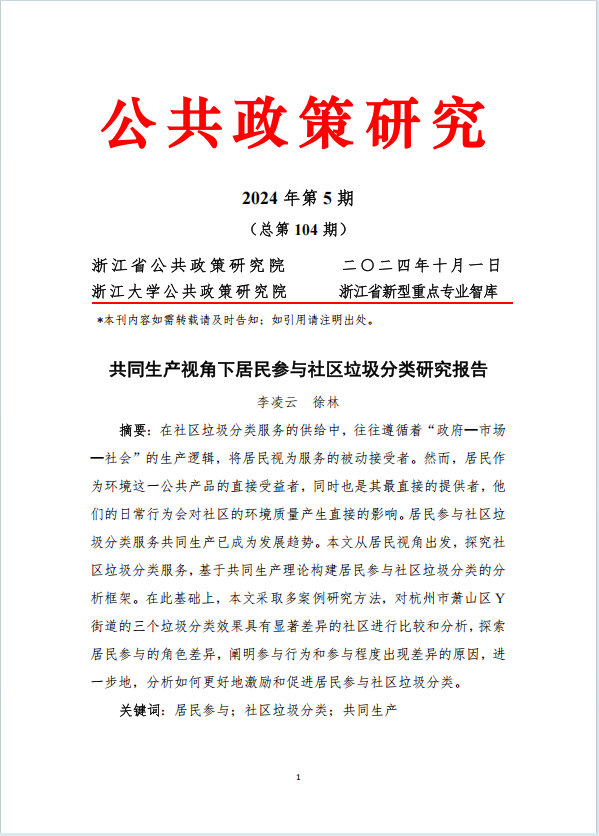2024年第5期(总第104期):共同生产视角下居民参与社区垃圾分类研究报告