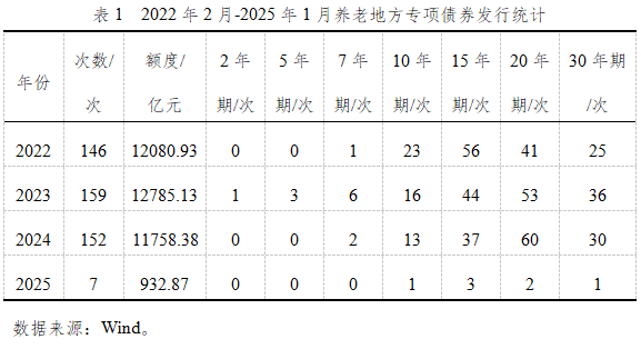 发行规模“先增后减”,2023年达历史峰值。养老地方专项债券的发行呈现显著的周期性特征。2022年发行146次,规模达到1.21万亿元;2023年发行次数增长至159次,规模增至1.28万亿元,发行频次增长2.9%,发行规模增长5.8%,创统计周期内最高水平;2024年发行次数小幅回调至152次,同期规模降至1.18万亿元;而2025年仅前1个月发行次数仅有7次,规模仅达932.87亿元,不足上年同期的8%。这种剧烈波动可能与地方政府债务限额动态调整以及养老基建项目阶段性融资需求变化密切相关。