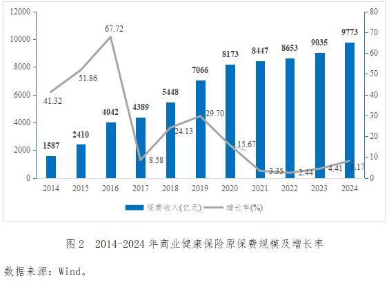 规模持续扩张,增速逐渐趋稳。从规模上看,我国商业健康保险保费收入在2014-2024的十一年间始终保持着稳定增长,2014年保费收入仅为1587亿元,而2024年保费收入已然飙升至9773亿元,十一年间整体规模增长了不止6倍,商险市场规模的持续扩容也反映出我国居民对于商业保险的重视程度与日俱增,进而促使市场需求不断膨胀。从增速上看,保费收入增长呈现“先陡后缓”的显著特征:前期增长快速,2016年增速一度高达67.72%,此时正处于行业早期爆发式增长阶段;后期增速趋缓,2019年之后增速逐年下滑,到2022年增速仅为2.44%,后续年份略有回调上升,但也仅维持在一个较低水平。虽然保费收入增速在低水平徘徊,但始终保持正向增长,表明行业从高速扩张转向更稳健的高质量发展阶段,整体形成“规模持续做大、增速理性调整”的发展格局。