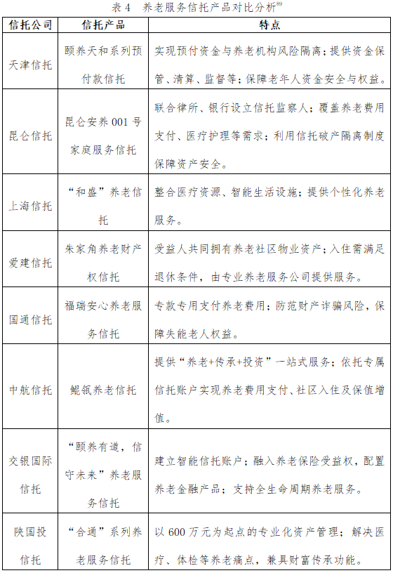 服务模式向综合化演进。近年来,我国养老服务信托几经更新迭代,发展至今,养老服务信托产品已从一开始的仅具备资金管理功能到如今发展成包含支付、医疗、居住、理财等多功能在内的复合产品。以市场上典型的养老服务信托产品为例,昆仑信托“昆仑安养001号家庭服务信托”以银行、律所为第三方检察人,覆盖养老费用和医疗护理等多元需求;上海信托“和盛养老信托”整合医疗资源、智能生活设施,提供个性化养老服务;中航信托鲲瓴养老信托实现费用支付、社区入住与资产增值一站式服务等。现有养老服务信托公司通过与银行/保险/律所/社区运营商等机构的合作,满足多元化的市场需求的同时,又通过专业化工提升了综合服务的质量,这标志着养老服务信托逐渐向生态化解决方案转型。
