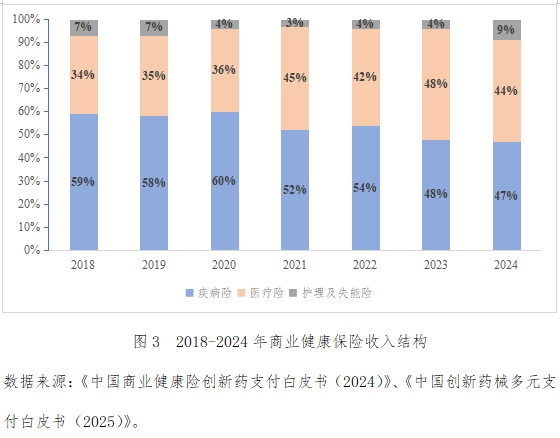 多元险种结构演进,疾病险与医疗险双轮驱动发展。其中疾病险虽然长期占据主要份额,但是占比有所降低,2018年的占比为59%,之后处于持续波动之中,到2024年占比仅为47%,但仍然占据重要份额;而医疗险的占比逐渐上升,从2018年的34%,振荡升至2023年的48%,该变化是推动整个险种结构发生变化的一个重要因素,表明越来越多的家庭重视在医疗过程中的医疗费用补偿以及对医疗服务的覆盖面要求;护理及失能险的占比始终尾超过10%,从2018年的7%平缓增长至2024年的9%,仍具有较大的发展空间。总体而言,商业健康保险的险种结构正从以疾病险单一主导,逐渐向疾病险、医疗险双核驱动,并附加护理及失能险等新兴险种多元化发展的格局过渡。