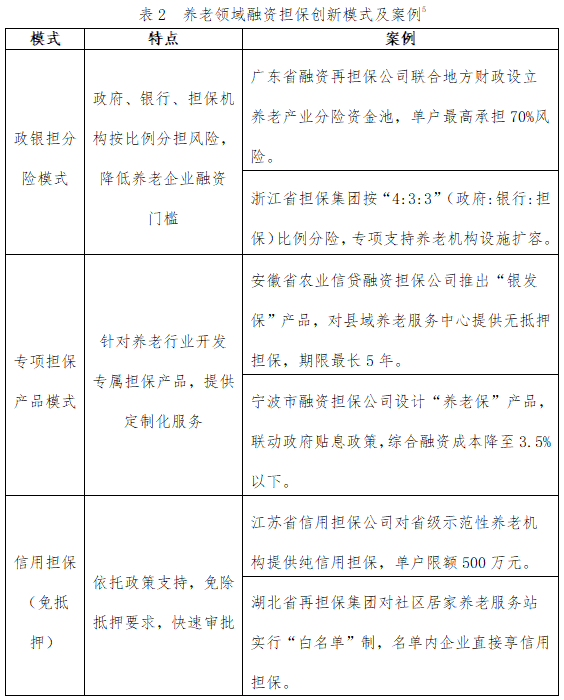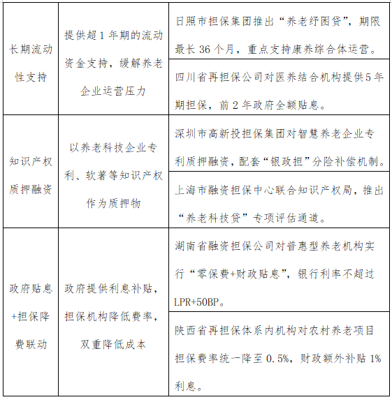 政策工具和担保产品持续创新。为鼓励养老产业蓬勃发展,各地不断推出多元化的养老融资担保产品和相关政策工具。专项担保产品模式下,各地政府性担保机构开发专属产品,为养老产业提供定制化服务。例如,安徽省的“银发保”产品和宁波市的“养老保”产品,分别通过无抵押担保和政府贴息政策,显著降低养老企业融资成本。而江苏省和湖北省则依托信用担保模式免除抵押要求,进一步简化了审批流程,提升了融资效率。此外,还有地区通过提供长期性的流动性资金支持养老企业;部分一线城市(上海、深圳)则支持以养老相关科技专利和软著为质押物进行融资;政府贴息和担保降费联动也是部分地区融资担保的重要手段。尽管这些创新模式在短期内取得了积极成效,但其长期覆盖面和可持续性仍需进一步评估。